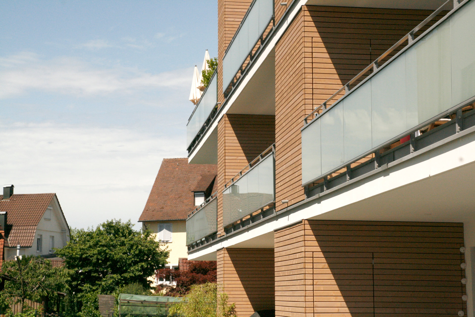Neubau in moderner Optik mit Holzelementen: Wohnungen, Büroeinheit und Café in einer Immobilie kombiniert.